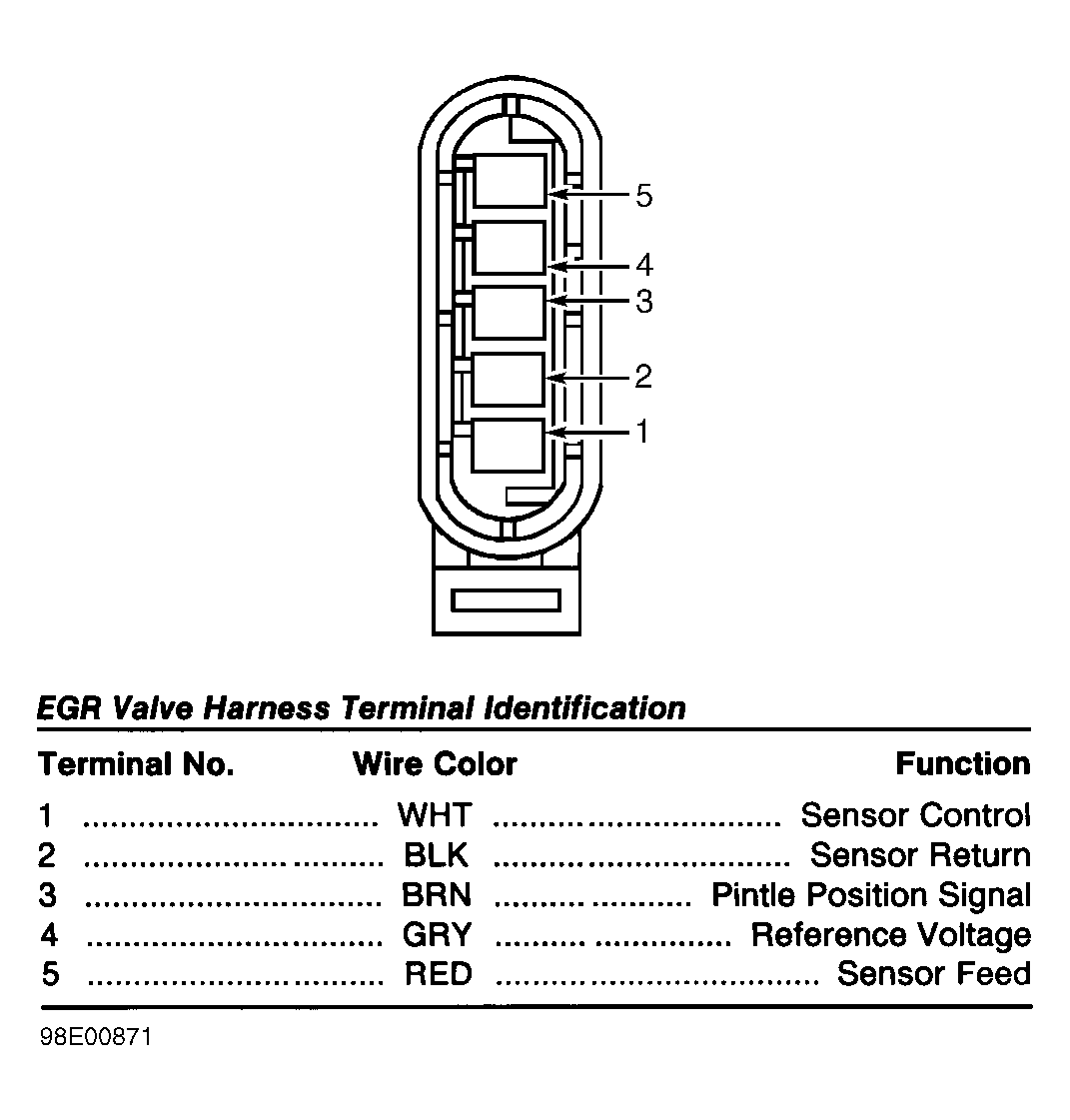 - Turn ignition switch to RUN position. Remove EGR valve, leaving harness connector attached. Push EGR pintle in and hold pintle in. Using a voltmeter, backprobe sensor signal circuit (Brown wire) at EGR valve harness connector. If no voltage exists, go to next step. If any voltage exists, go to step 14).