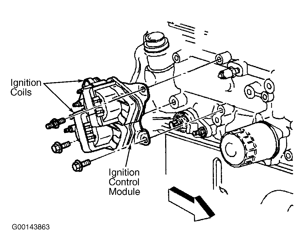 - Remove 3 ignition control module/coil assembly retaining bolts. See Fig 1. Remove ignition control module/coil assembly. Remove 2 ignition coil retaining bolts from each coil. Remove ignition coil(s) from ignition control module. Remove ignition control module.