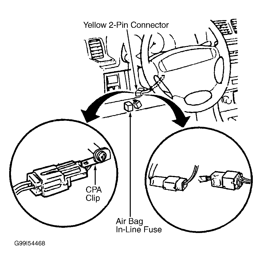 2. Remove steering column opening trim plate. Remove Connector Position Assurance (CPA) clip, release lock tab, and disconnect driver air bag Yellow 2-pin connector. See Fig 1.