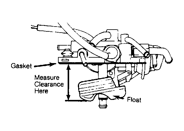 Position air horn upright. Allow float to hang by its own weight. Measure clearance between bottom of float and gasket. Float drop must be within specification. Bend float stop for adjustment. See Fig 1 .