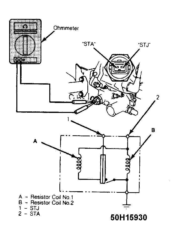 - Start engine and bring to normal operating temperature. Ensure resistance across terminals "STJ" and "STA" is 40-60 ohms. Ensure resistance across terminals "STA" and ground is 20-80 ohms. Replace thermal timer if not as specified.