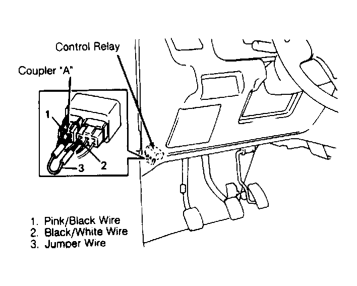 - Ensure ignition is off. Check for fuel leaks by connecting jumper wire between Pink/Black and Black/White wires of control relay (under left side dash near kick panel). See Fig 1 . Turn ignition on, leave engine off. This will activate fuel pump. If fuel leaks are not present, install remaining components. Refill cooling system.