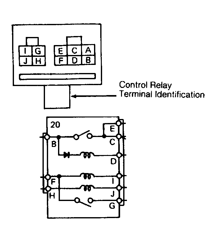 6. Energize relay by applying battery voltage to terminal "H" and ground to terminal "J". Check for voltage at terminal "G". If battery voltage does not exist, replace control relay.