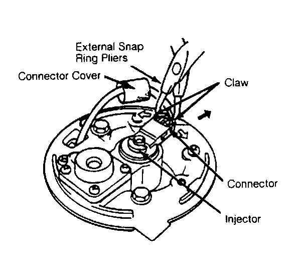 - Using external snap ring pliers, carefully open electrical connector claws of injector and disconnect connector. See Fig 1 . Slide injector harness grommet from throttle body and remove injector.