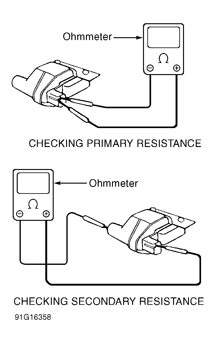 Disconnect electrical connector and ignition coil wire from ignition coil. Using ohmmeter, measure primary and secondary resistance. See Fig 1 . Replace ignition coil if resistance readings are not within specification. See IGNITION COIL RESISTANCE table.