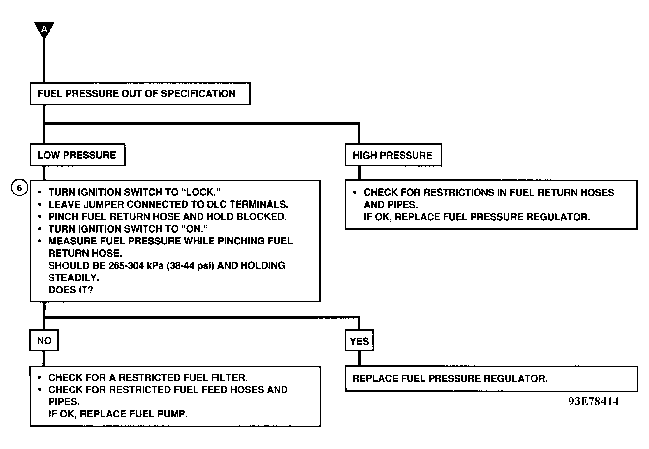 (1) With ignition on, engine off, pressure regulator vacuum hose disconnected and plugged, and battery voltage applied to terminal FP in diagnostic connector (located on left shock tower).