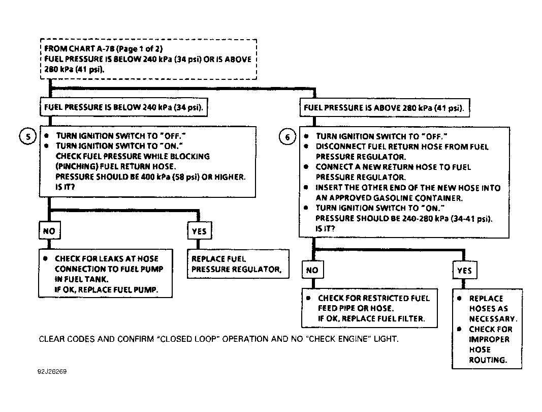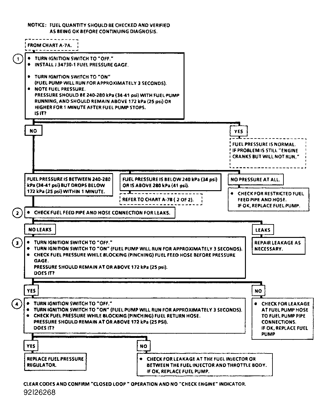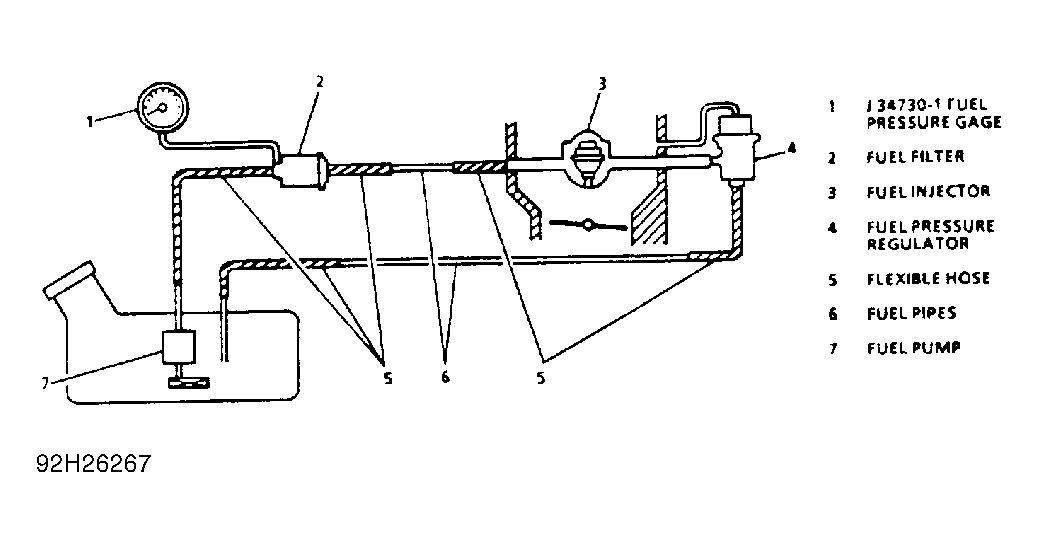 Release fuel pressure. See FUEL PRESSURE RELEASE . Disconnect negative battery cable. Attach Fuel Pressure Gauge(J-34730-1) and Adapter (J-37746) at fuel filter inlet bolt. See Fig 1 . Fuel filter is located on right side of frame, above rear differential. Connect negative battery cable. Check fuel pressure. See Figure , Figure and Figure . Release fuel pressure. Remove fuel pressure gauge. Install fuel line at fuel filter, and tighten it to 26 ft. lbs. (35 N.m).