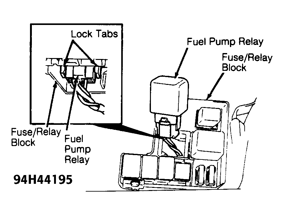 - Loosen fuel tank cap to release fuel tank pressure. Remove cover from fuse/relay block located in left front corner of engine compartment, behind battery. Remove coolant reservoir from bracket. Remove fuse/relay block retaining screws. From underneath fuse/relay block, release 2 locking tabs of fuel pump relay. See Fig 1