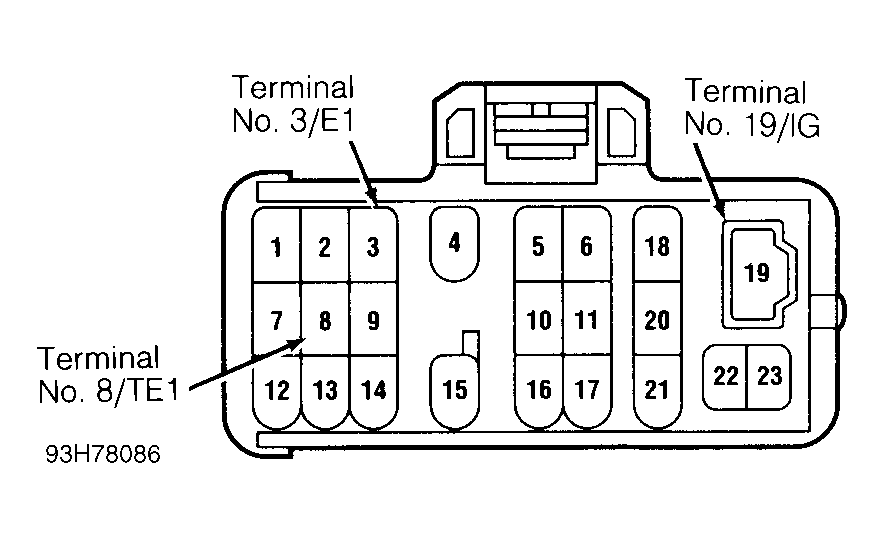 - Turn engine off. Connect timing light to No. 1 spark plug wire. Install jumper wire between terminals No. 3/E1 (Brown wire) and No. 8/TE1 (Blue/White wire) of DLC. See Fig 1.