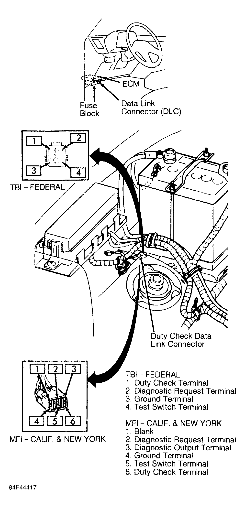 - Turn ignition off. Using a jumper wire, connect between duty check data link connector terminals No. 2 and 3 (TBI - Federal) or No. 2 and 4 (MFI - Calif. and New York). Turn ignition on and observe MIL to read fault codes. If fault codes are stored, code will flash 3 times starting with the lowest code. Proceed to appropriate charts under DIAGNOSTIC CODE CHARTS to diagnose fault codes. See SELF-DIAGNOSTICS DIRECTORY table.