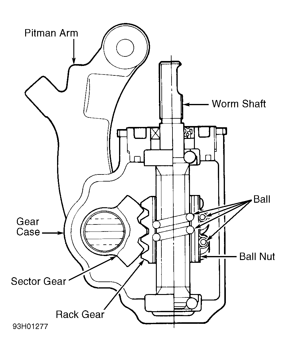Steering system uses steel balls in a recirculating pattern to transfer rotary motion of steering shaft into a linear motion in the rack gear. Rack gear, in turn, moves the sector gear. See Fig 1 . The pitman arm is solidly attached to sector gear and, through the tie rods, allows the vehicle to turn.