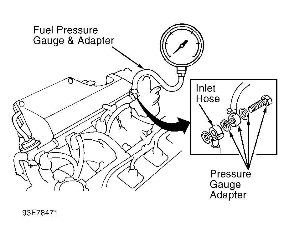 . Tighten adapter retaining bolt to 22 ft. lbs. (29 N.m). Install Fuel Pressure Gauge (J-34730-1A) to adapter. Reconnect negative battery cable. Turn ignition on.