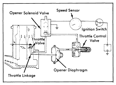 - If 12 volts exist, throttle opener solenoid or throttle control valve are at fault. To test throttle control valve, remove vacuum hose to throttle opener solenoid. If vacuum is present, replace faulty throttle control valve.