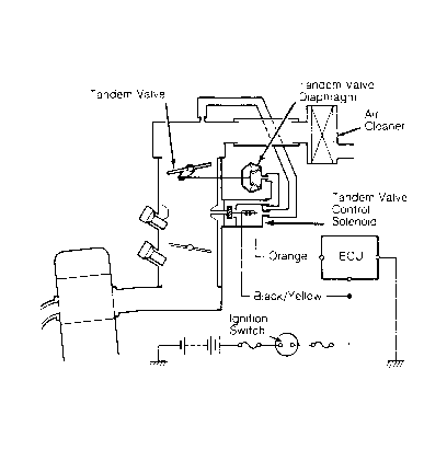 2. If vacuum is not present, go to step 5). If vacuum is present, warm engine to operating temperature (cooling fan comes on). Slowly open throttle. If vacuum is present, tandem control system is functioning properly. If vacuum is not present, substitute a known good ECU and retest. If symptom is rectified, replace original ECU.