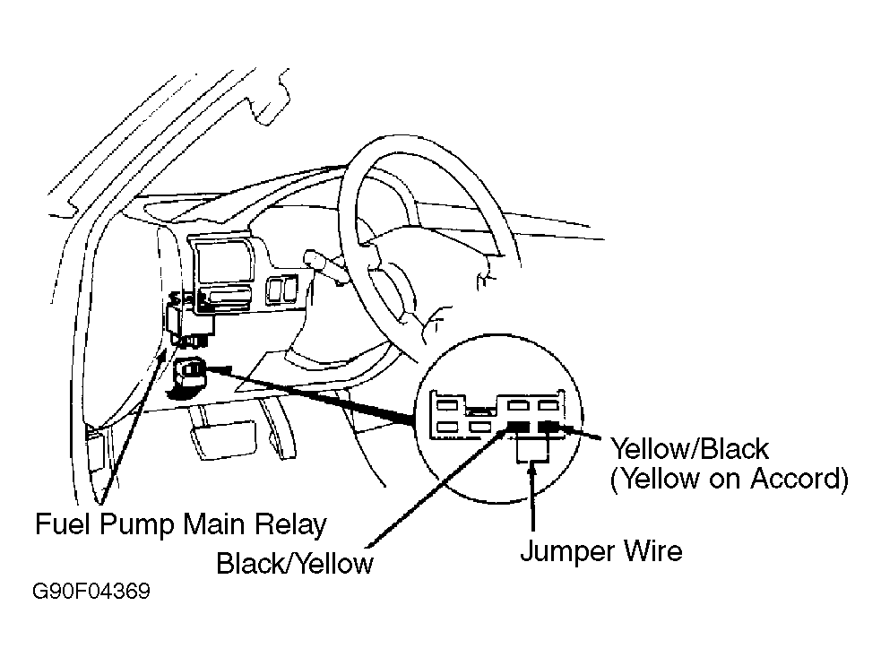 2. Remove connector from fuel pump main relay. See Fig 1 . Using a test light, check for power on Black/Yellow wire at fuel pump relay connector. If power is present, connect a jumper wire between Black/Yellow wire (B+) and Yellow/Black wire. If fuel pump runs, proceed to step 3). If fuel pump fails to run, see SYSTEM/COMPONENT TESTS article in this section. If no voltage is present on the Black/Yellow wire, check for open in wire between fuel pump main relay connector and No. 2 fuse on fuse box. Proceed to step 3) after repairing circuit.