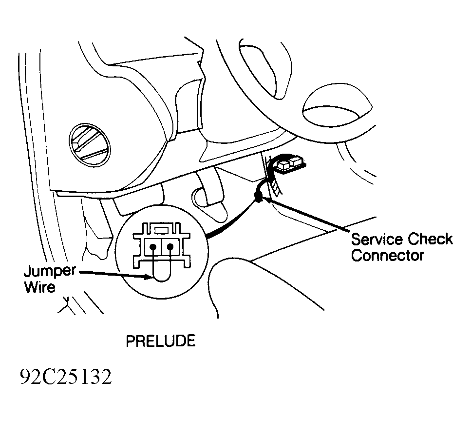 With ignition off, insert jumper wire in service check connector terminals, located near center console on Prelude. See Fig 1 . Turn ignition switch to ON position. Diagnostic Trouble Codes (DTCs) will be indicated by a series of long and short flashes on MIL. The number of long flashes indicates the number in the 10s column. The number of short flashes indicates the number in the 1s column. For example, 4 long flashes followed by 3 short flashes would indicate DTC 43.