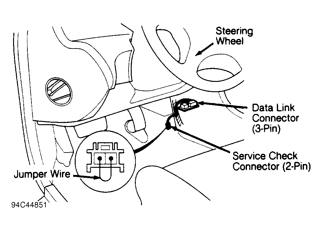 Turn ignition off. Insert jumper wire in service check connector, located behind center console. See Fig 1 .