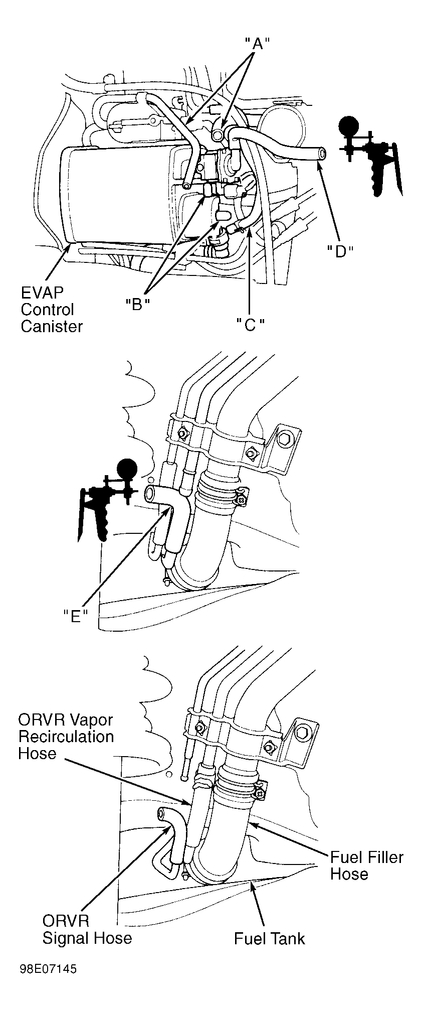 Ensure fuel tank is less than half full. Remove fuel fill cap to relieve pressure, then reinstall cap. Remove left rear inner fender. Disconnect the On-Board Refueling Vapor Recovery (ORVR) vapor recirculation hose and connect a vacuum pump to the vapor recirculation hose. Plug vapor recirculation line. See Figure . Apply vacuum to the ORVR vapor recirculation hose. If vacuum holds, replace the ORVR vent shut valve. If vacuum does not hold, float is okay.
