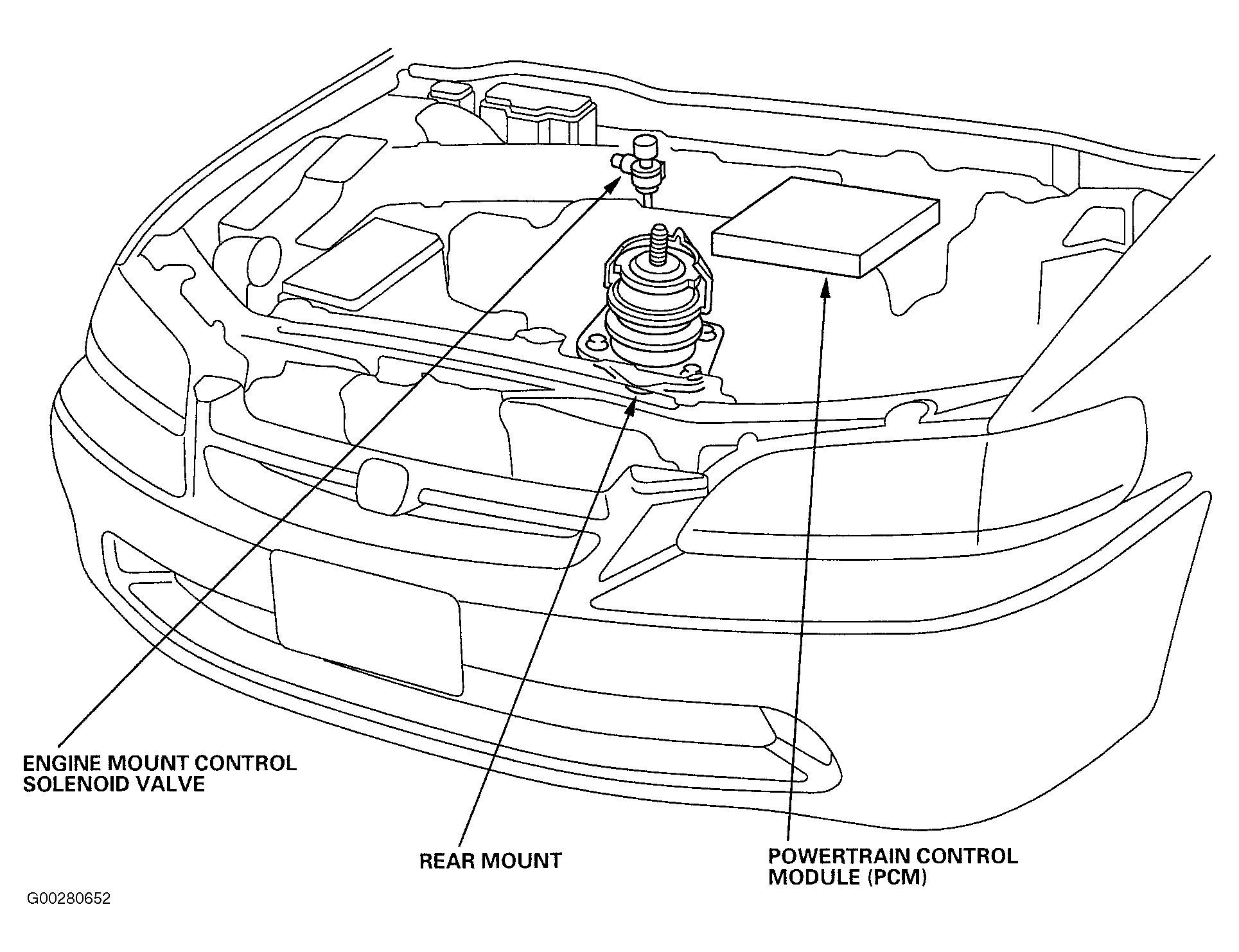 - Remove vacuum pump/gauge from vacuum hose. Reconnect upper vacuum hose to engine mount control solenoid valve. Disconnect lower vacuum hose from engine mount control solenoid valve, and connect vacuum pump/gauge to hose. If vacuum is present, replace engine mount control solenoid valve. If vacuum is not present, repair engine mount control system as necessary.