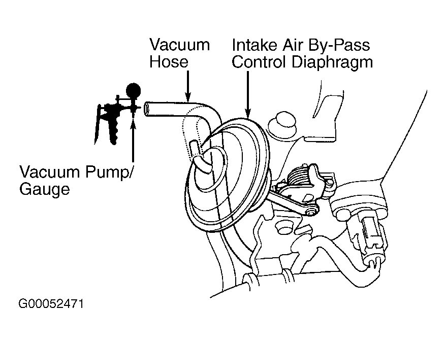 - Start engine and allow to idle. Disconnect vacuum hose from IAB control diaphragm and connect a vacuum pump/gauge to hose. See Fig 1. If vacuum does not exist, go to next step. If vacuum exists, go to step 6.