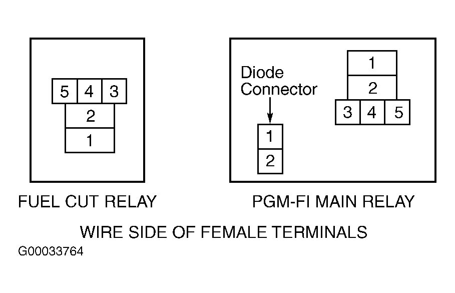 - Turn ignition off. Locate PGM-FI main relay and disconnect 5-pin electrical connector. See PGM-FI MAIN RELAY LOCATION table. Using DVOM, measure continuity between body ground and PGM-FI main relay diode connector terminal No. 2 (Black wire). Diode is located next to PGM-FI main relay. See WIRING DIAGRAMS article. If continuity is present, go to next step. If continuity is not present, repair open circuit between PGM-FI main relay and body ground point. Ground point is located at top, mid-point on engine, above MAP sensor.