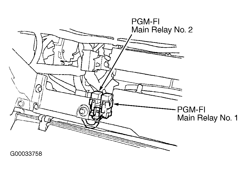 - Write down radio anti-theft code and radio frequencies of preset buttons. Turn ignition off. Remove glove box. Remove PGM-FI main relay No. 2. See Figure. Turn ignition on. Using a DVOM, measure voltage between body ground and PGM-FI main relay No. 2 connector terminal No. 4 (Yellow/Black wire). See WIRING DIAGRAMS article. If battery voltage is present, go to next step. If battery voltage is not present, locate and repair open circuit in Yellow/Black wire between PGM-FI main relay No. 1 and PGM-FI main relay No. 2.