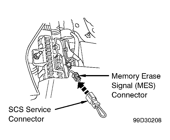 5. Disconnect SCS service connector from MES connector within 4 seconds. AIR BAG warning light will indicate that memory is erased by blinking 2 times. Turn ignition switch to OFF position and wait 10 seconds. DTC's are erased if AIR BAG warning light comes on for 6 seconds and then goes out.