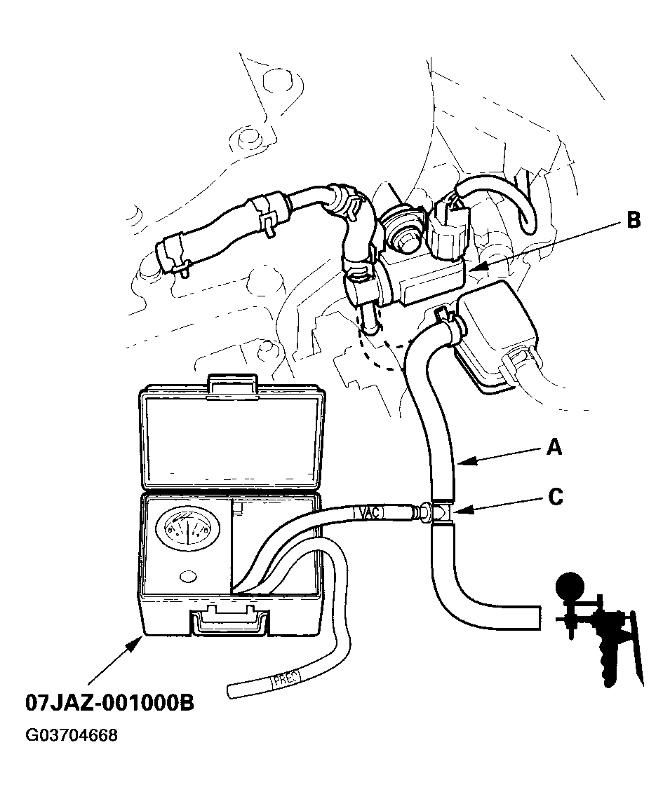 10. Disconnect the vacuum hose (purge line) (A) from the EVAP canister purge valve (B) in the engine compartment, and connect a T-fitting (C) from the vacuum gauge and the vacuum pump/gauge, 0-30 in.Hg, to the vacuum hose (A) as shown in Fig 3.