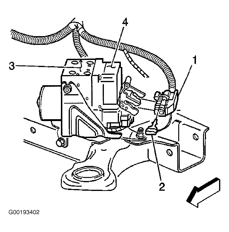 - Raise and support vehicle. Remove driver front wheel. Pull push-in retainers to emove bumper fascia extension. Remove connector position assurance (2) from Electronic Brake Control Module (EBCM) harness connector (1). Ensure ignition switch is in OFF position. Rotate EBCM harness connector tab to unlocked position and disconnect EBCM harness connector (1). See Fig 1.