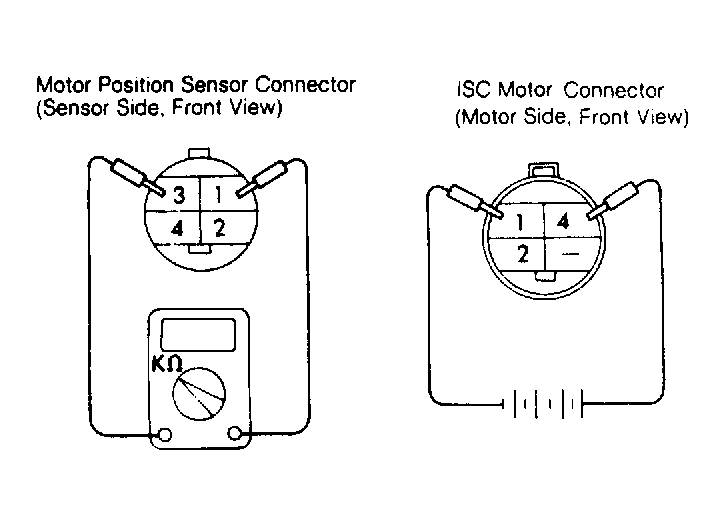1. Disconnect ISC motor connector. Check motor coil continuity between terminals No. 1 and 4. See Figure for terminal location. Resistance should be 5-35 ohms. If resistance is zero ohms or far more than specification, an open or short exists in motor coil. Replace ISC servo assembly.