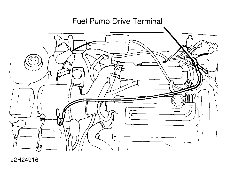 9. After testing is completed, release fuel pressure. See FUEL PRESSURE RELEASE. Disconnect fuel pressure gauge from adapter bolt. Ensure hose connection is covered by a shop towel to prevent fuel spray. Remove adapter bolt and replace with original bolt. Apply battery voltage to fuel pump drive terminal. See Figure -Fig 1 . Check for leaks.