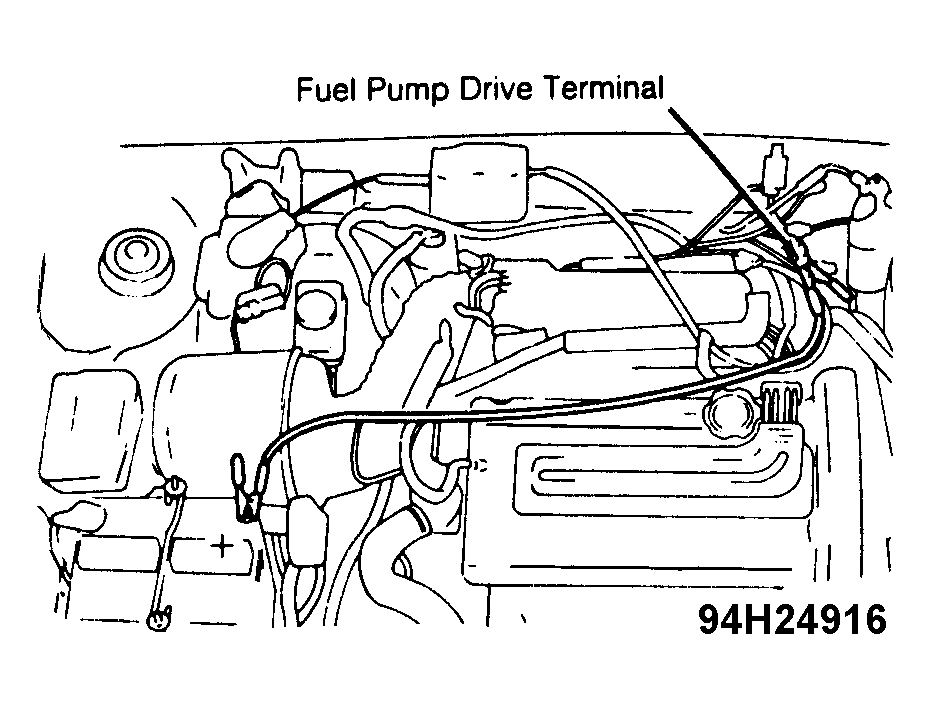 Turn ignition off. Apply battery voltage to fuel pump drive terminal (Yellow wire). See Fig 1 . Remove fuel tank cap and listen for fuel pump operation. Pinch fuel hoses by hand and ensure fuel pressure can be felt.