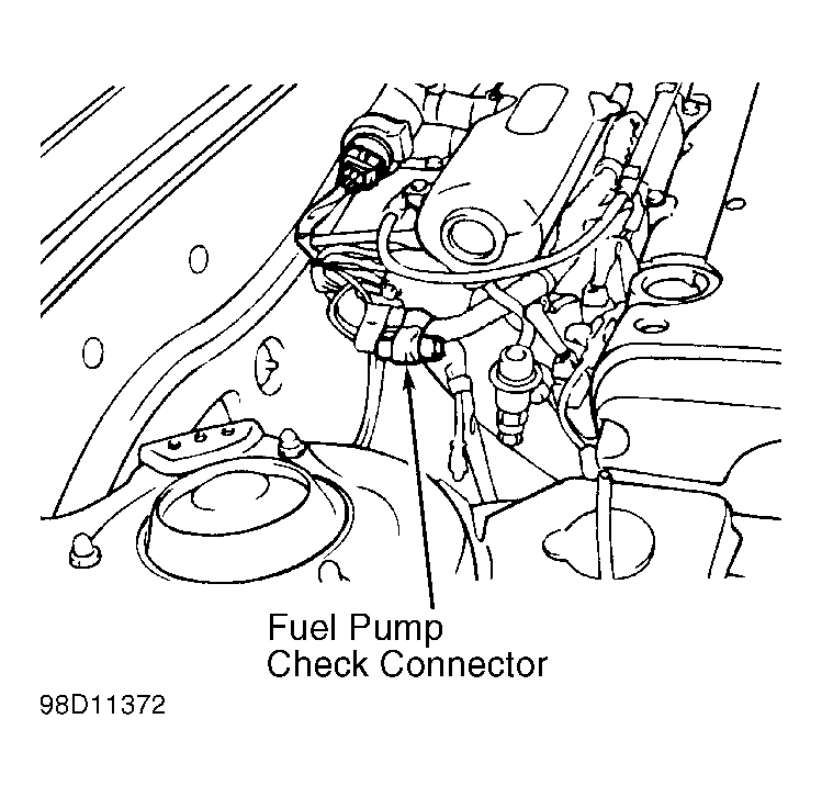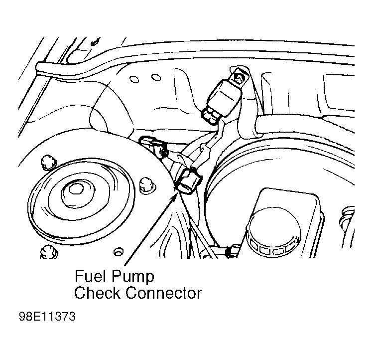 Turn ignition off. Apply battery voltage to fuel pump check terminal connector. See FUEL PUMP CHECK TERMINAL WIRE IDENTIFICATION table. See Fig 1, Fig 2 or Fig 3 . Remove fuel tank cap and listen for fuel pump operation. Pinch fuel hoses by hand and ensure fuel pressure can be felt.