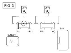- Disconnect connector (B), and measure for resistance between connector (C) and (B1) and between (B2) and (A) as shown in Fig 3.