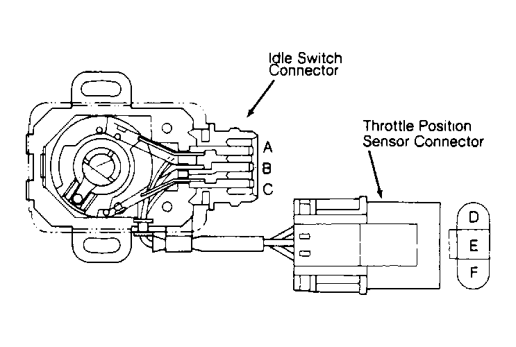 - Disconnect throttle position sensor harness connector. Connect ohmmeter leads between throttle position sensor terminals "E" and "F". See Fig 1