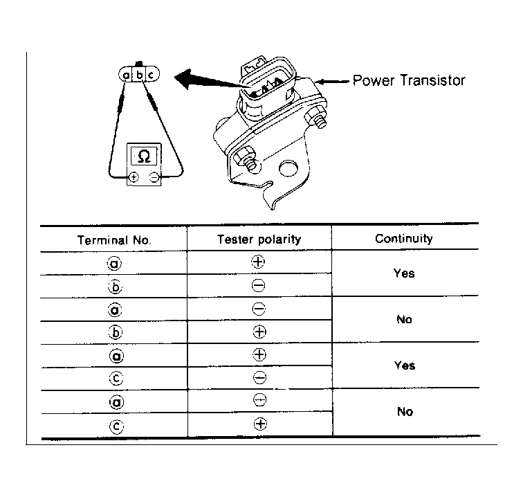 Disconnect power transistor harness connector. Using ohmmeter, check power transistor continuity. See Fig 1 . Replace power transistor if results are not as specified.