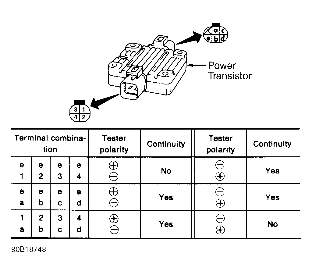 Disconnect power transistor harness connector. Using ohmmeter, check power transistor continuity. See Fig 1 . Replace power transistor if results are not as specified.