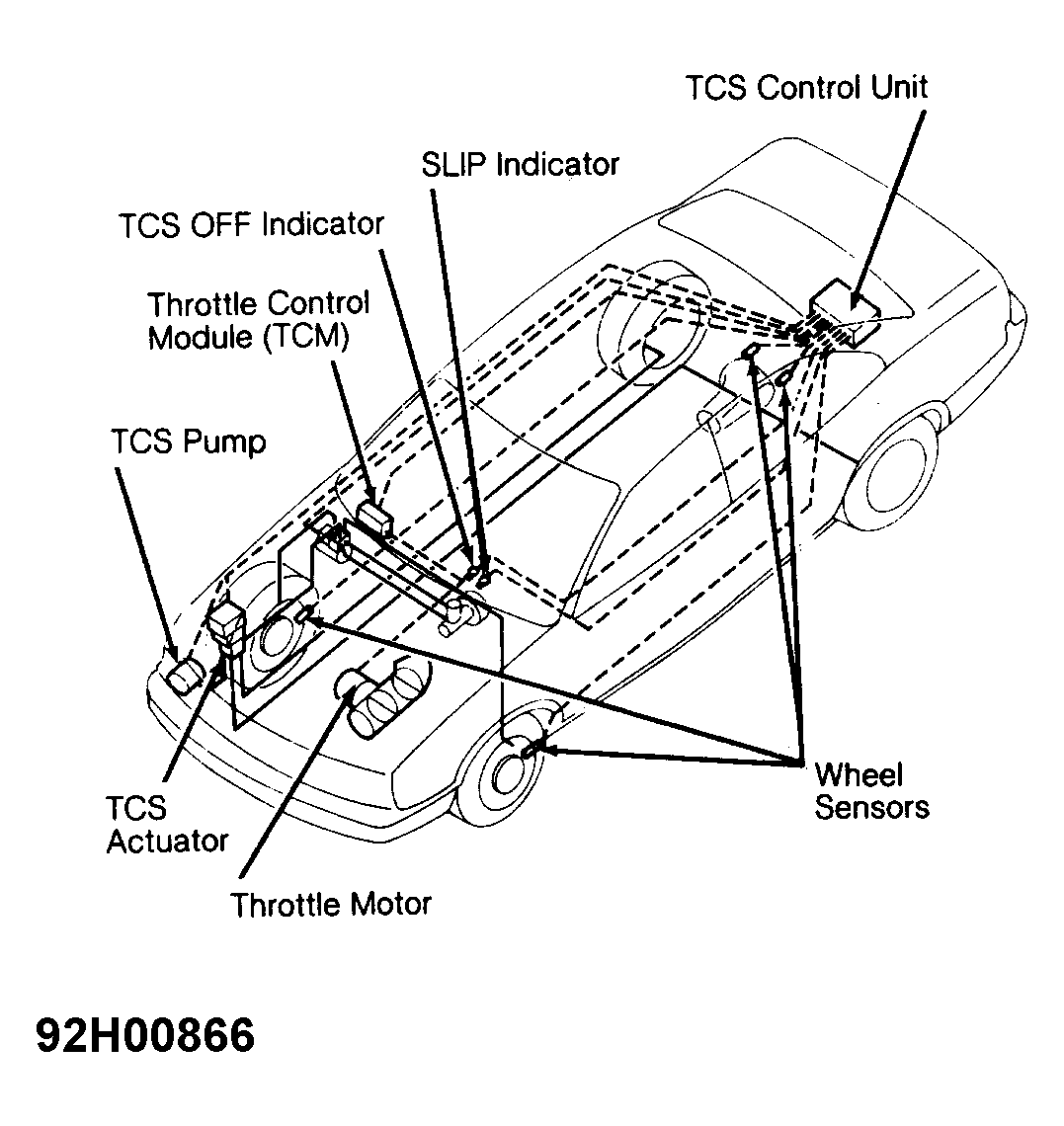 TCS control unit uses input signals from the wheel sensors and other sources. Control unit evaluates factors such as rear wheel slip, road and driving conditions. After evaluating these factors, the control unit sends a DC current (about 5 amps, about 2 amps, or zero amps) to TCS actuator and/or Throttle Control Module (TCM).