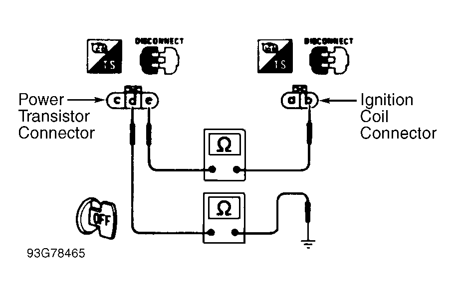 - Turn ignition off. Disconnect power transistor and ignition coil harness connectors. Check continuity between ignition coil terminal "b" to power transistor terminal "e" (Green/Yellow wire). See Fig 1 .