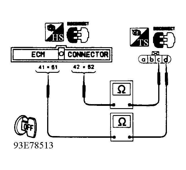 Turn ignition off and disconnect ECM harness connector. Verify harness continuity between CKP sensor connector terminal "d" (Green/Black wire) and ECM connector terminals No. 41 and 51 (120-degree signal), and between terminal "c" (Green/Yellow wire) and ECM terminals No. 42 and 52 (one degree signal). See Figure , Figure and Figure . If continuity is present, go to next step. If continuity is not present, repair harness or connectors as necessary.