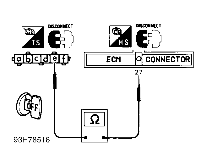 Turn ignition off and disconnect ECM harness connector. Check continuity between MAF sensor connector terminal "e" (White wire) and ECM terminal No. 27. If continuity is present, go to next step. If continuity is not present, repair harness or connectors as necessary. See Figure , Figure and Figure .