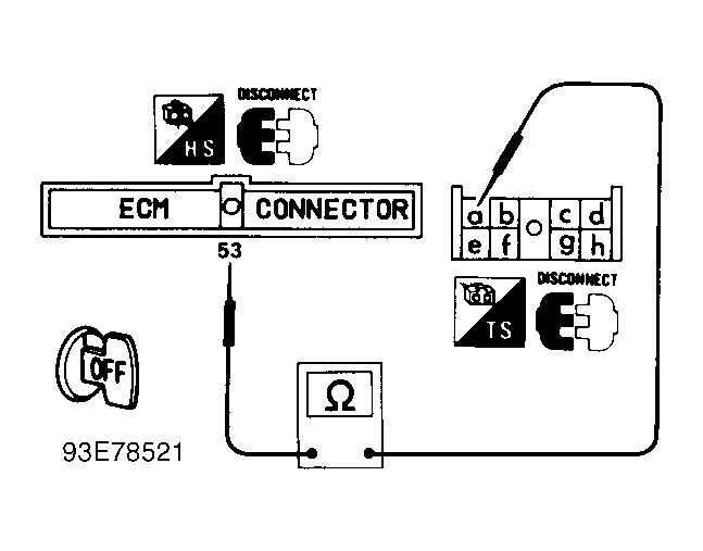 Turn ignition off and disconnect ECM harness connector and combination meter harness connector. Check harness continuity between ECM terminal No. 53 and combination meter terminal "a" (Black/Yellow wire). See Figure , Figure , Fig 1 and Fig 2 . If continuity is not present, repair harness or connectors as necessary and perform FINAL CHECK.