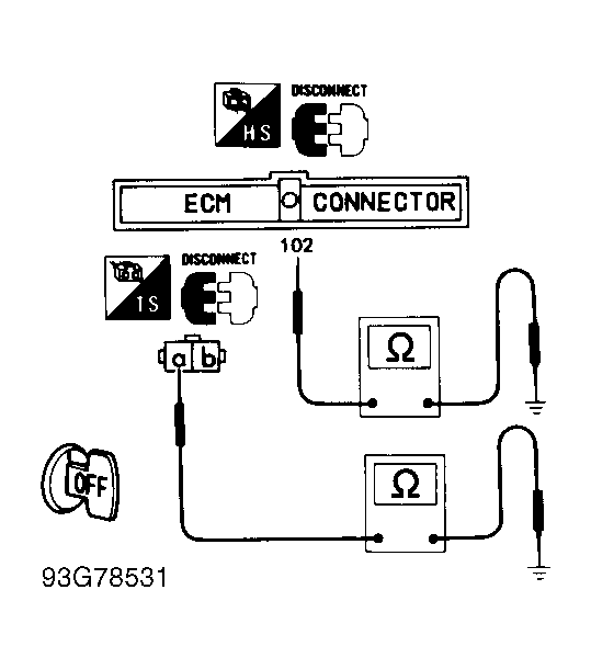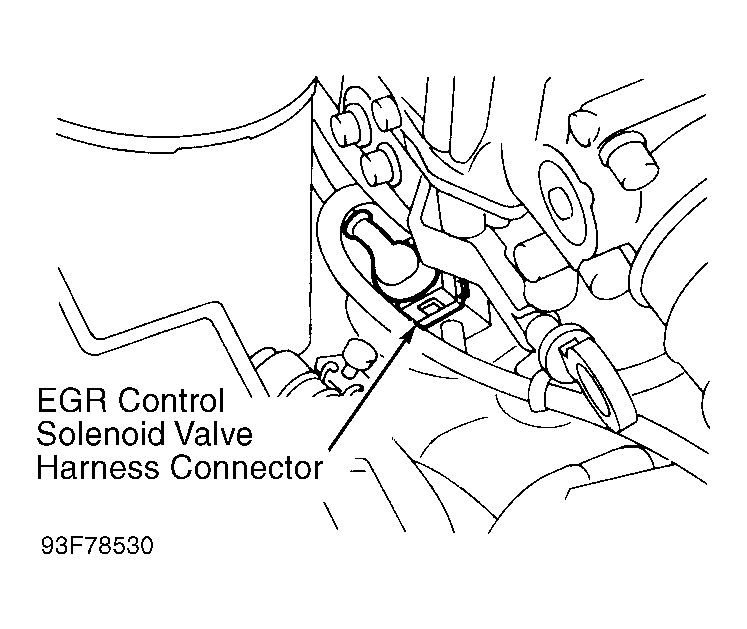 Turn engine off and disconnect ECM harness connector. Disconnect EGR control solenoid valve harness connector. Verify harness continuity between ECM terminal No. 102 (Red/Black wire) and ground, and between EGR control solenoid valve harness connector terminal "a" (Red/Black wire) and ground. See Fig 1 and Fig 2 . If continuity does not exist, go to next step. If there is continuity, repair harness or connectors between ECM and EGR control solenoid valve as necessary.