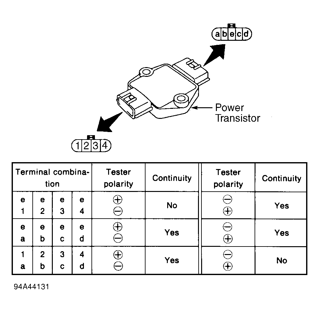 Disconnect power transistor harness connector. Using ohmmeter, check power transistor continuity. See Fig 1 . Replace power transistor if results are not as specified.