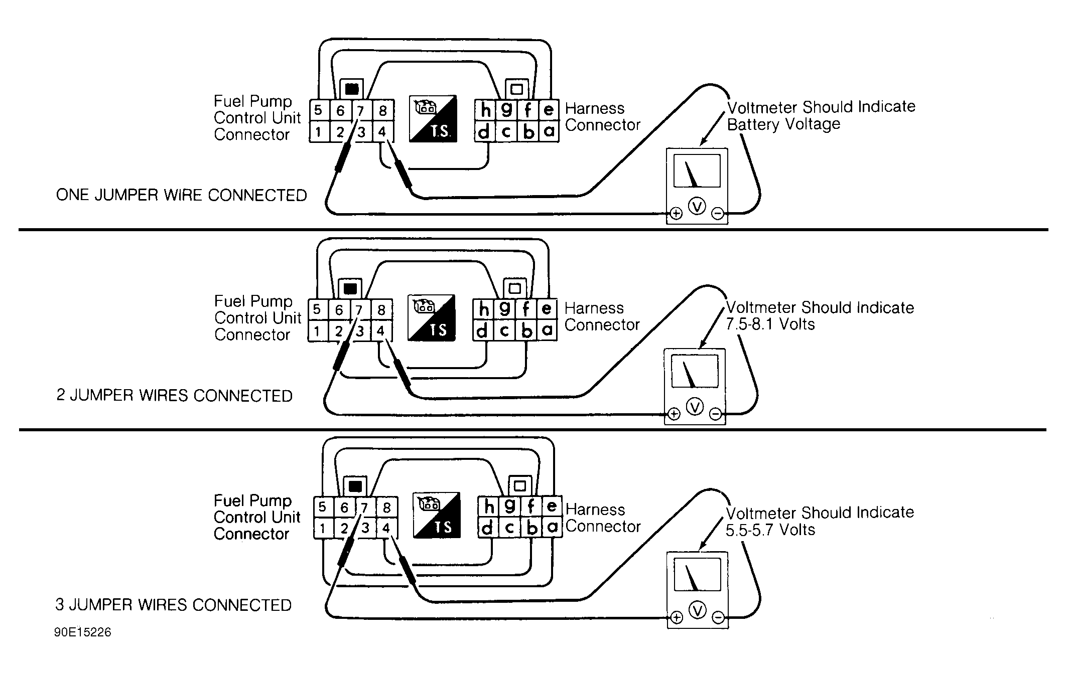 - Connect one, then 2 and finally 3 jumper wires as indicated in illustration. Using a DVOM, check voltage between terminals No. 4 and 7 as each jumper wire is connected. See Fig 1