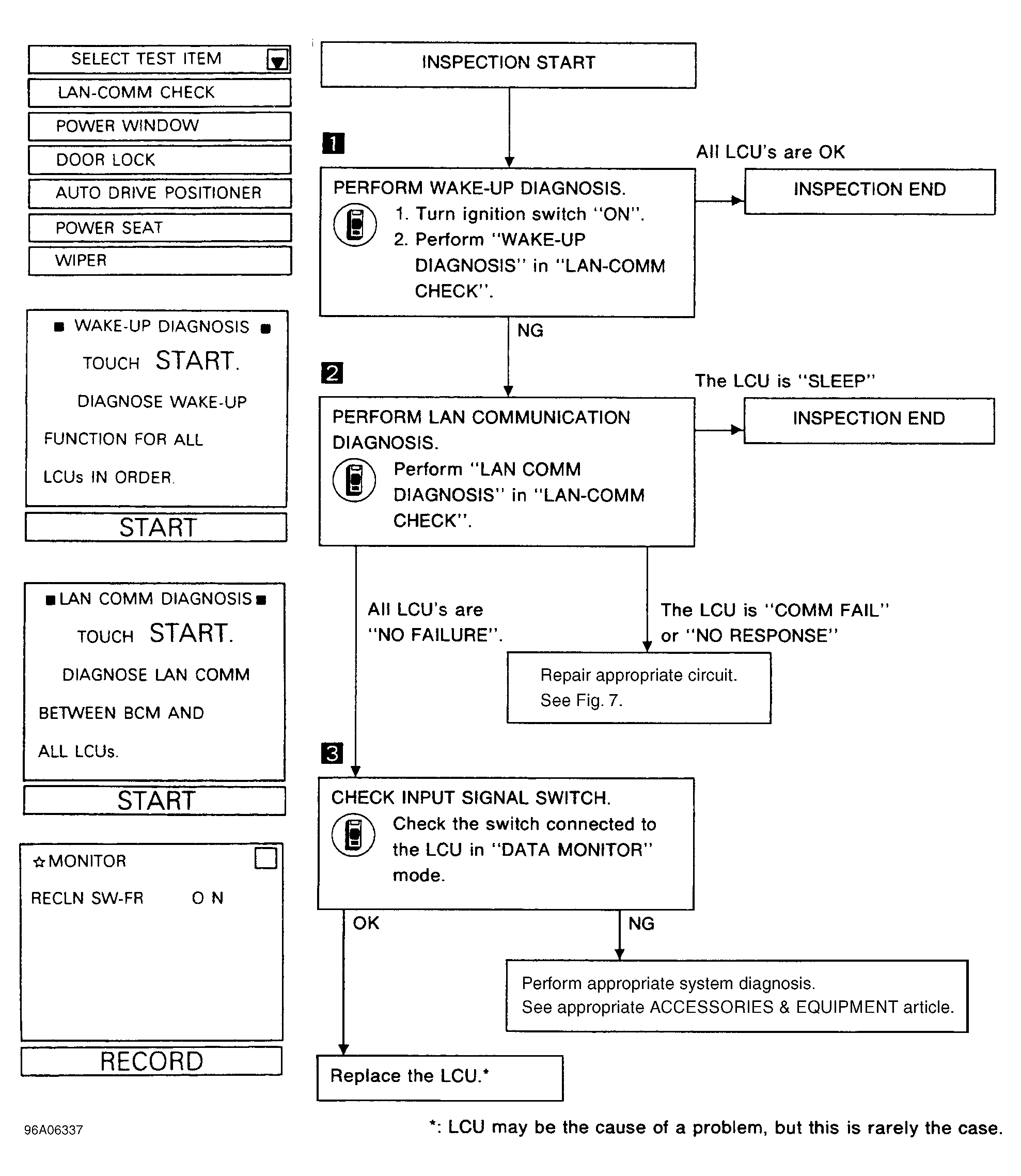 This mode checks if the respective LCU's are appropriately shifted to wake-up mode when conditions call for such action. To perform wake-up diagnostics, enter LAN system diagnostics. See ENTERING LAN SYSTEM DIAGNOSTICS (above). Enter WAKE-UP DIAGNOSIS mode and perform diagnostic tests. See WAKE-UP MODE DIAGNOSTICS chart under DIAGNOSTIC CHARTS. See Figure .
