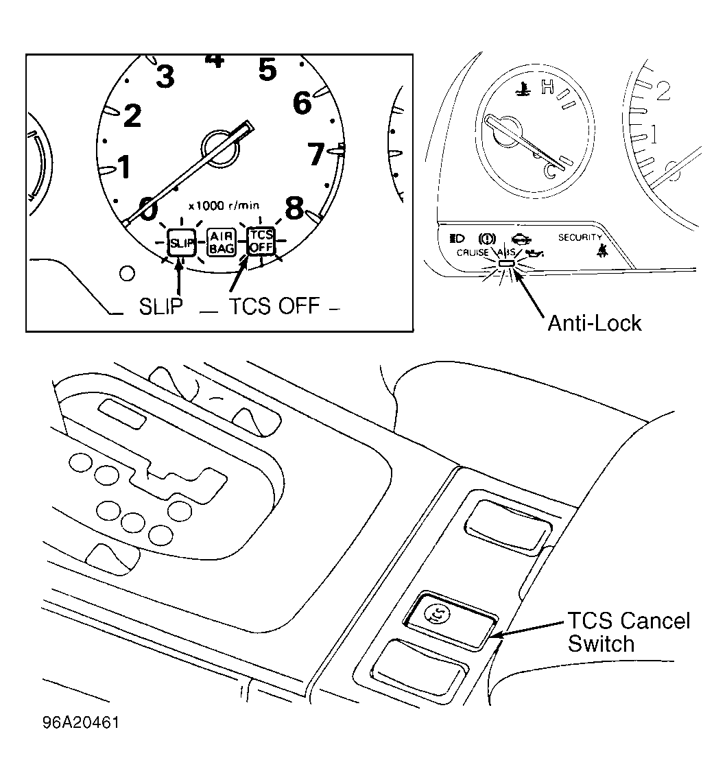 TCS control unit also possesses an ABS function. In addition, TCS control unit possesses self-diagnosis and fail-safe functions. When a fault is detected, system releases its control over throttle and brakes. SLIP and TCS OFF indicators and/or ABS warning lamps light up and the LED flashes number of times corresponding to fault location. See Figure , Figure and Figure .