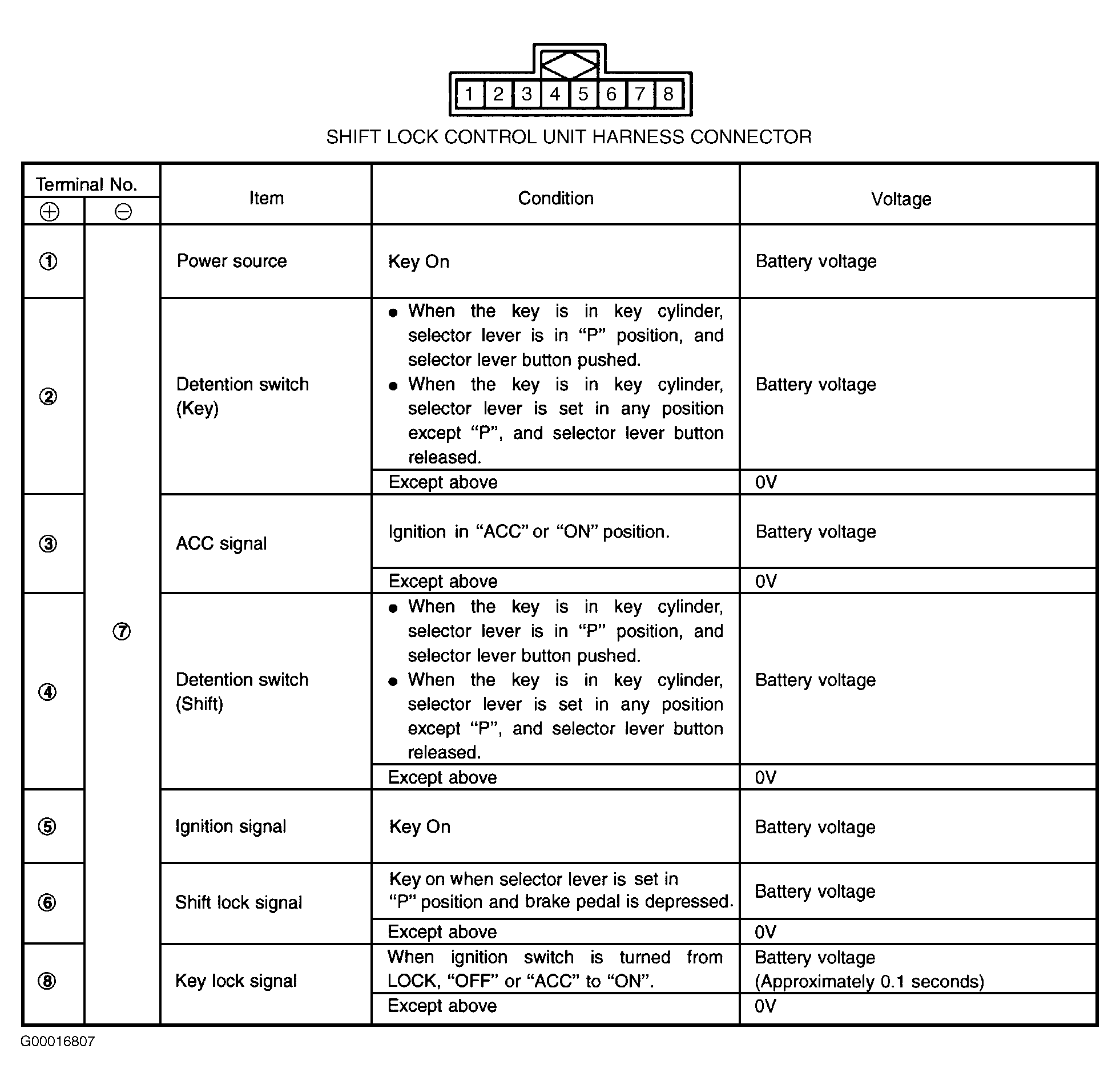 Fig 1: Shift Lock Control Unit Pin Voltage Table (Q45)