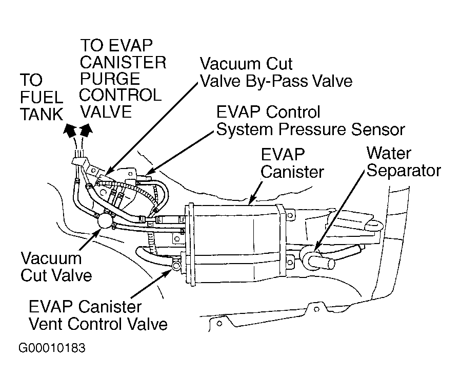 Using EVAP Service Port Adapter (J41413-OBD), connect suitable pressure pump with gauge to EVAP service port. See VACUUM DIAGRAMS article for location. Disconnect EVAP Canister Vent Control Valve (EVAP-CVCV) and vacuum cut valve by-pass valve harness connectors. See Fig 1 or Fig 2 . Using jumper wires, apply battery voltage to EVAP-CVCV and Vacuum cut valve by-pass valve terminals. Apply.2-.4 psi (1.38-2.76 kPa) of pressure to EVAP service port. Remove pressure pump from EVAP service port. Using Leak Detector (J41416), locate EVAP system leak.