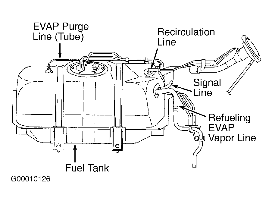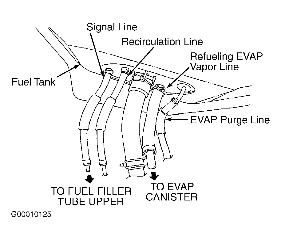 - Remove fuel filler cap. Disconnect signal line hose from fuel filler tube. Disconnect refueling EVAP vapor line hose from tube. See Fig 1 or Fig 2